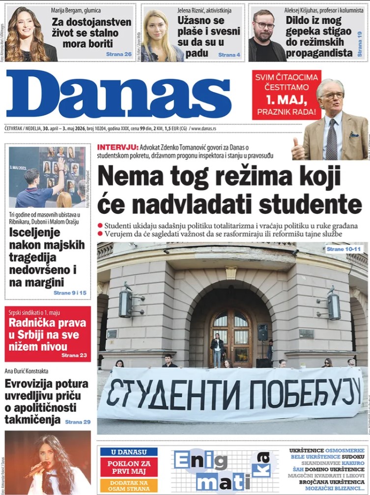 Почетна страна > Хроника > Насловне стране српске штампе 30. априла 2026.